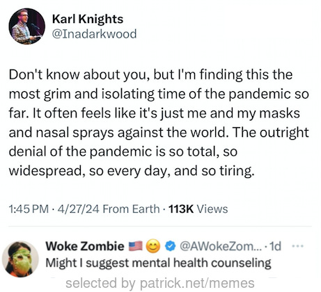 I looked up #4 the tweet about the pandemic. I couldn’t believe it was real. But there it was, in all of its glory. Please tell me that’s a parody account. People were responding in agreement! Who are these people?