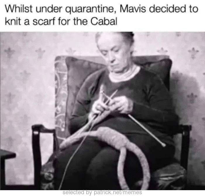 LOVE Mavis knitting the "scarf" for the cabal!